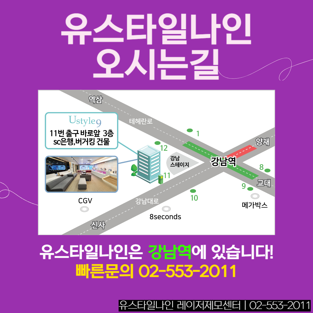 유스타일나인은 레이저제모만 진료하고 있습니다. 털을 없애는데에는 진심인 병원이겠죠. 믿으셔도 좋습니다. 털을 잘 없앤다고 자부할 수 있습니다. 그렇다면 털을 없애는 레이저제모 시술을 받을 때 중요하게 생각해보아야 하는 것에는 어떤 것이 있을까요? 강남역이라는 특성, 접근성을 확인해봐야 할 수 있습니다. 시술 부위에 따라서 6회서부터 10회 이상까지도 할수있기에 그만큼 병원을 방문해야 하는데요. 거기에 면도를 하고 오라고 하는 병원이라면 매 시술 시 마다 면도까지 하고 시술을 받으러 가야할 수 있는 겁니다.