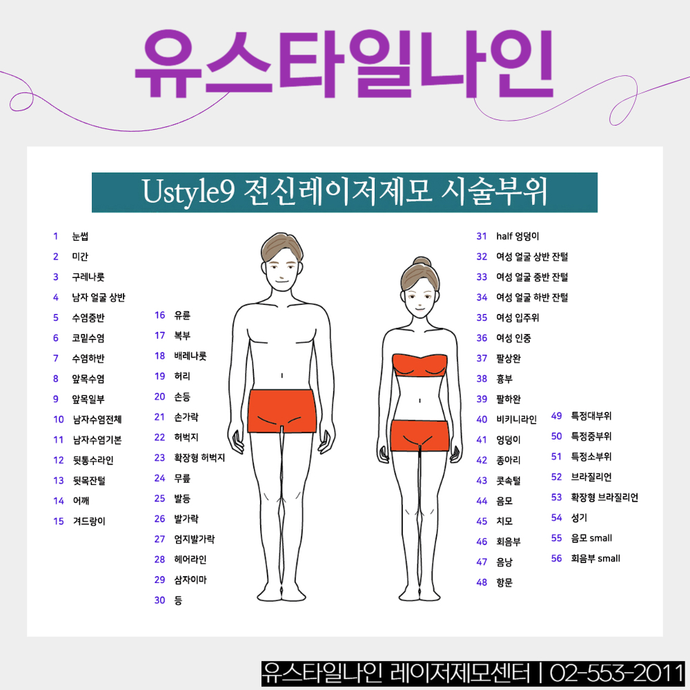강남역 레이저제모추천 제모피부과 유스타일나인은 전신 56개부위를 제모하고 있습니다. 제모하고 싶은 부위를 정하셔서 문의를 하시면 관련해서 궁금하신 부분이 해소될 수 있도록 상담을 하고 있습니다. 레이저제모는 병원마다 차이가 있으며 원하는 결과를 얻기 위한 총 시술 횟수와 패키지의 구성, 1인실에서 시술하는지와 면도는 누가 어디서 해야하는지, 찾아가기 편한 곳에 있어서 접근성이 좋은지, 몇가지 종류의 제모레이저가 있는지 등을 확인해보시는 것도 도움이 될 수 있습니다.