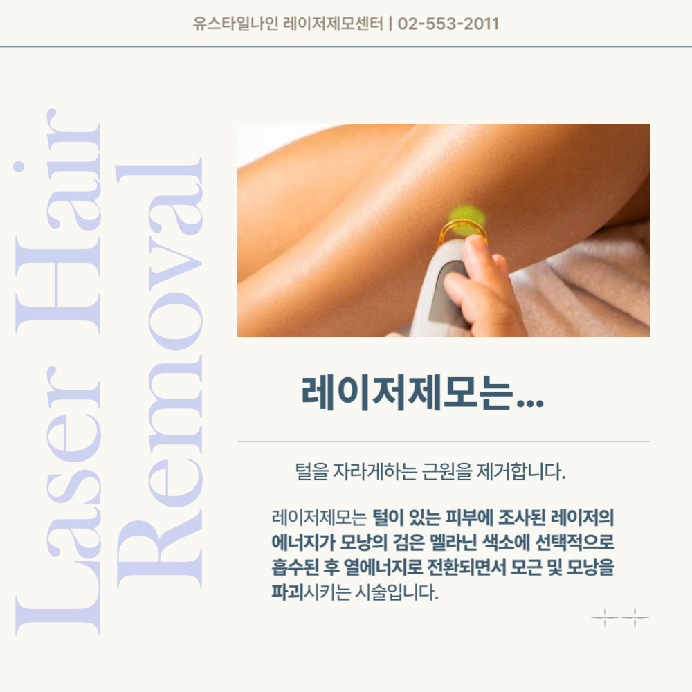 레이저제모는 모낭을 레이저를 이용해서 제거를 하는 방법으로, 털을 태워 모근과 모낭을 파괴해 털이 자랄 수 없도록 합니다. 레이저의 빛이 검은색 멜라닌 색소에만 반응하기때문에 다른 피부조직의 손상이나 불필요한 자극을 줄 일수있습니다. 다만 흰털이나 노란털엔 효과가 없습니다.