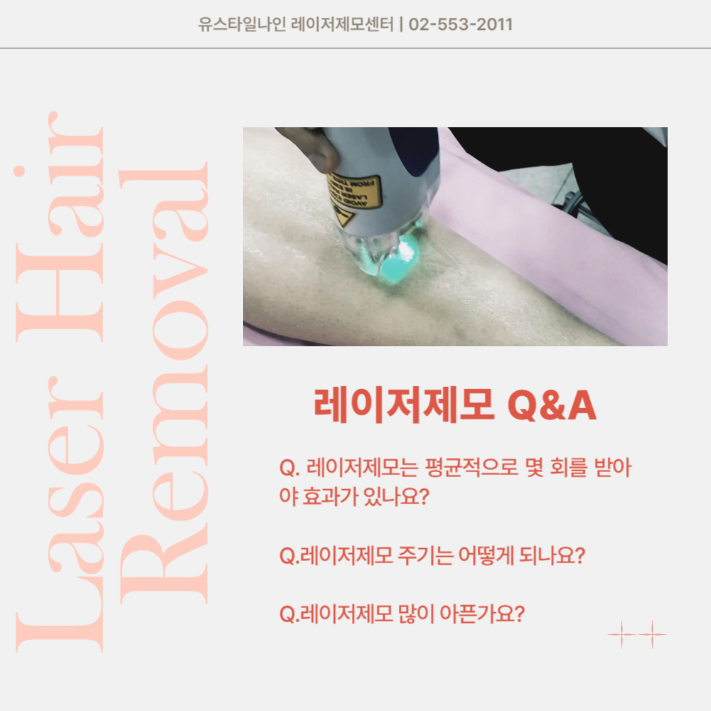 레이저제모는 한두번만에 끝나는 시술은 아닙니다. 레이저 시술시 한번 할때마다 약 10~15% 정도의 털이 감모가 되는데, 이를 약 5~6주 정도마다 한번씩 꾸준하게 받아주시면 평균횟수 이상 진행이 되었을때 기존에 있던 양의 80~90%정도의 양이 감모가 되는 것을 볼 수 있습니다.
