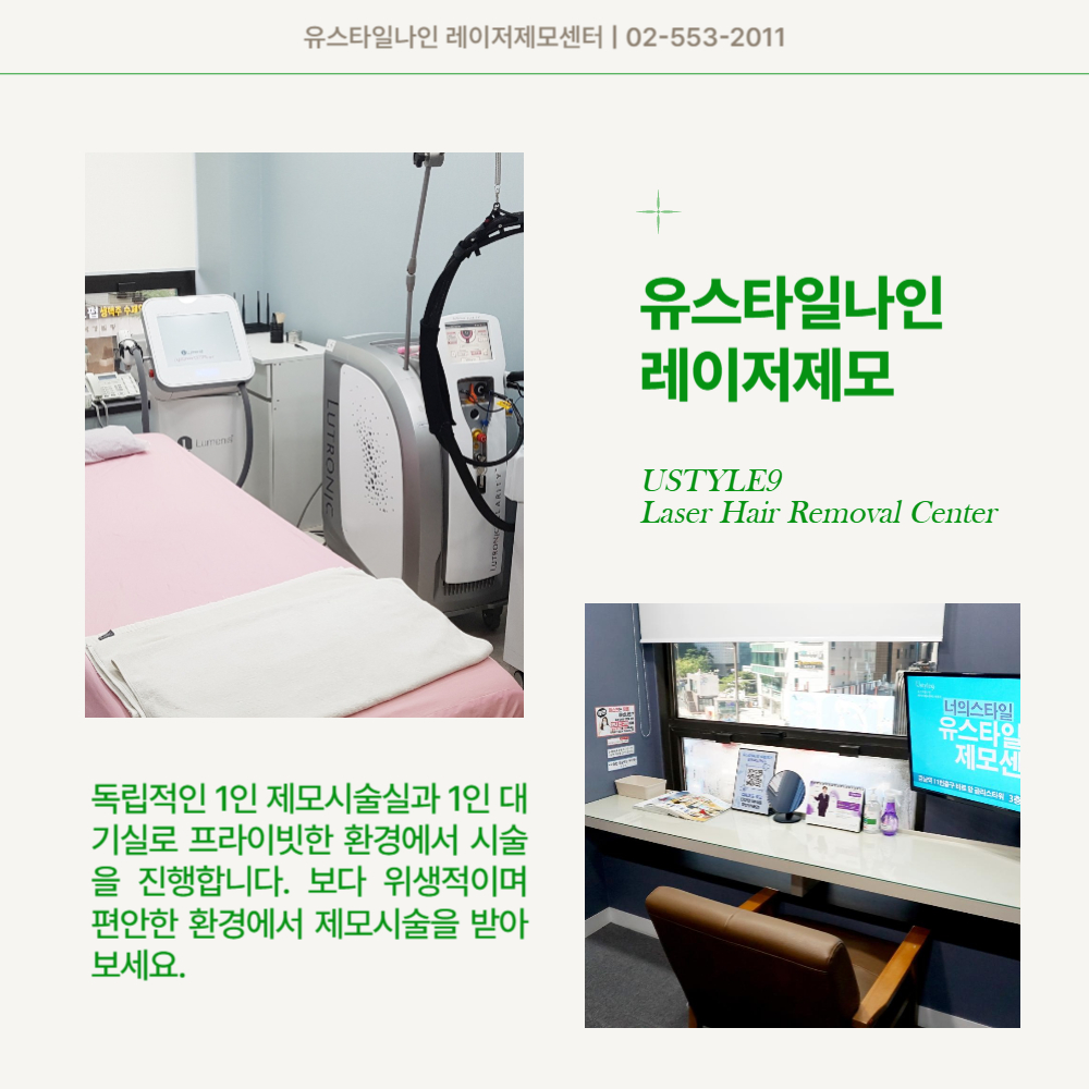 하지만 레이저제모만을 전문적으로 시술하는 강남역 유스타일나인은 병원에서 직접 털과 피부 상태를 확인한 뒤 면도부터 시술, 진정케어까지 하나의 시스템으로 진행하는 곳이에요. 고객편의와 함께 시술의 완성도를 높이기 위한 필요한 서비슬고 할수있어요.