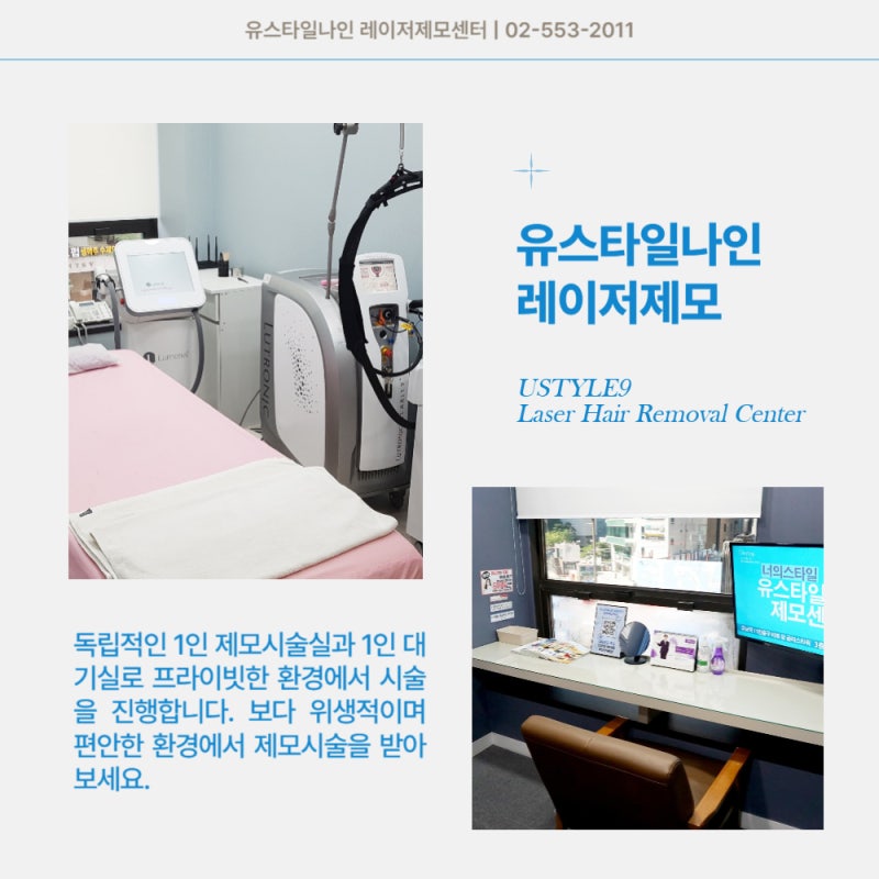 레이저제모을 중점으로 시술하는 곳에서는 다양한 부분들을 고려해 다양한 파장대의 제모레이저를 구비하고 있으며 레이저제모만을 위한 시스템이 마련되어 있습니다. 혼자서 편하게 이용할수있는 1인실과 시술 전케어부터 시술 후케어까지 원스톱으로 진행되는 시스템으로 편하게 관리받아보실 수 있습니다.