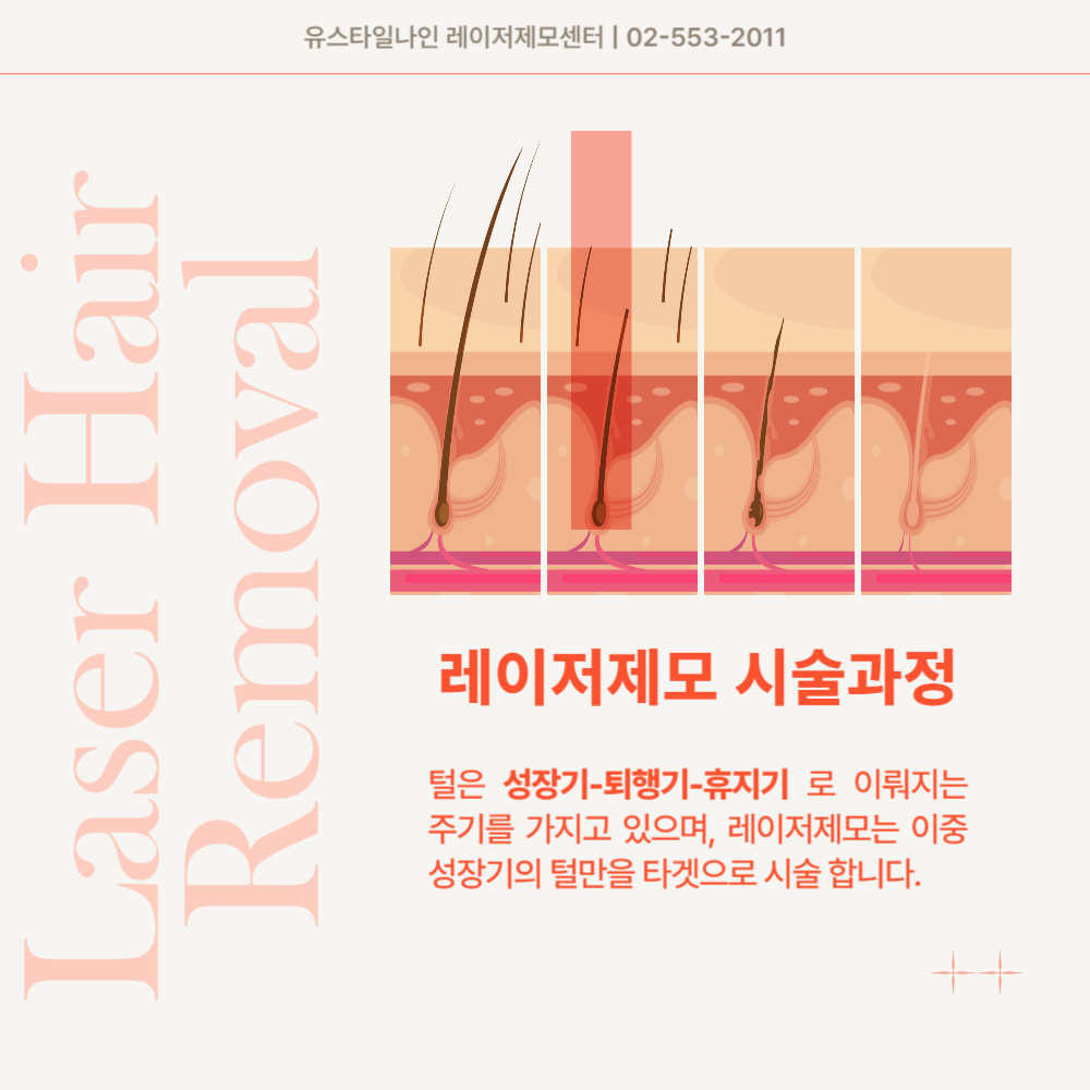 레이저제모는 검은색멜라닌 색소에만 반응하는 레이저의 특징을 이용해 피푸표면에 있는 털들만 일시적으로 제거하는 방법이 아닌 피부안쪽에 자리하고 있는 털이자라는 공간인 모낭을 선택적으로 제거해서 반영구적인 제모상태를 만들어줄 수 있는 방법입니다. 무엇보다 반복적으로 관리해야하는 면도나 왁싱같은 번거로움이 없어질수있어 늘 깔끔한 상태를 유지할 수 있는 장점을 가진방법이라 할 수 있습니다.
