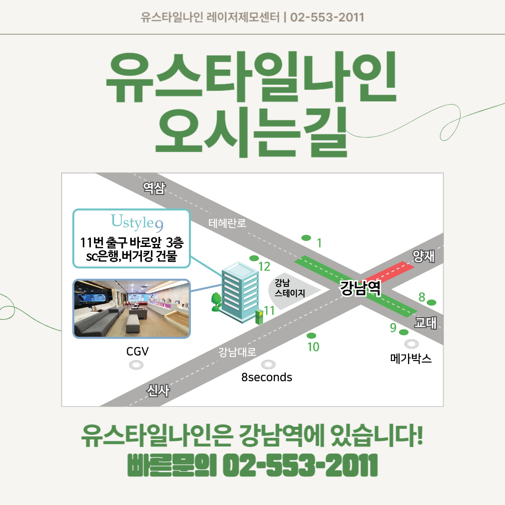 유스타일나인은 강남에서도 오랜시간 레이저제모를 해 온 병원이며 강남역 11번 출구 바로 앞 글라스타워 3층에 위치하여 오시는 길도 어렵지 않고 편하죠~ 좀 더 자세한 상담이 필요하신 분들은 아래의 카톡, 전화문의 배너를 클릭하시면 빠른상담 편하게 받아보실 수 있어요^^
