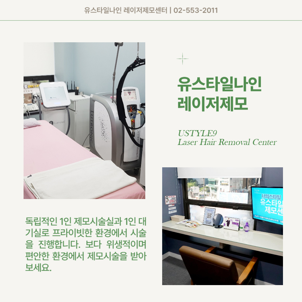 아무리 팔털제모 더라도 털을 치료하다보니 여성으로써 민망함을 느낄 수 밖에 없잖아요? 하지만 유스타일나인에서는 1인 실을 제공해 주는 병원이라 안심하고 털을 없앨 수 있어 좋은 거 같아요. 게다가 다양한 레이저 장비들을 종류별로 갖추고 털 상태 맞춰 다양한 레이저를 사용해 주니 좀 더 완성도 높은 제모가 되는 거 같습니다.