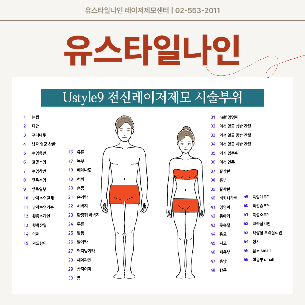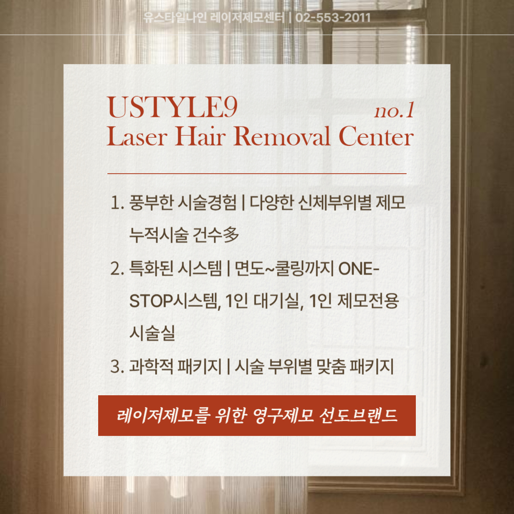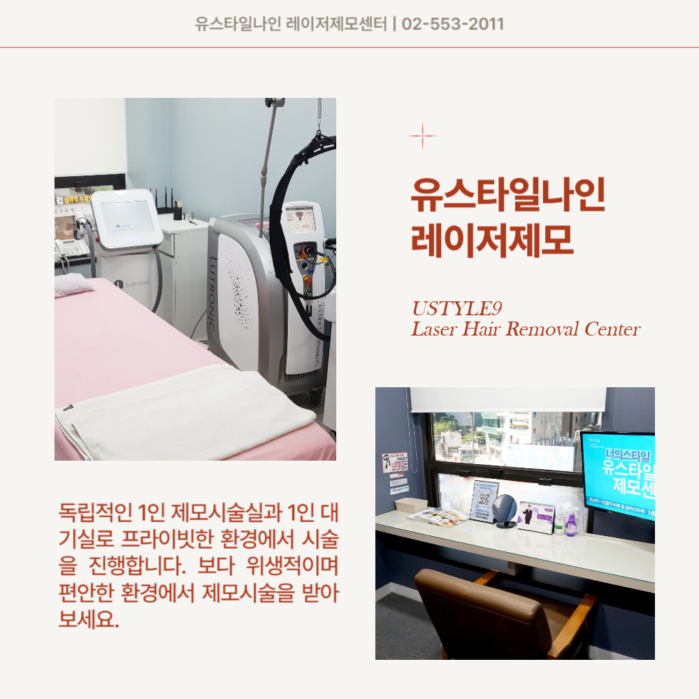 레이저제모를 하는곳은 많지만 레이저제모만을 하는곳은 그렇지 않습니다. 레이저제모만을 전문적으로 하는곳이라면 제모에대한 걱정없이 내원만하면 시술전 면도에서부터 개인의 피부와 털상태를 고려한 맞춤형제모가 프라이빗한 1인실에서 이루어집니다. 시술전 갈아입을 옷부터 시술후케어까지 제모의 시작과끝을 함께할수있는곳 유스타일나인의 전문성있는 레이저제모를 뒷목제모를 시작해보시기 바랍니다.